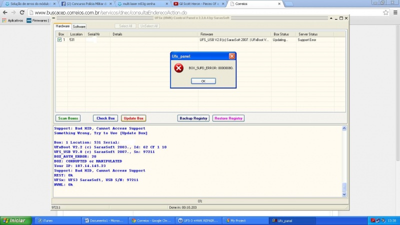 Boa tarde a todos, Depois que formatei minha máquina venho lutando para conseguir reinstalar minha hwk, já fiz esse procedimento várias vezes, porém me deparei com um problema onde não estou conseguindo solucionar, venho pedir ajuda aos amigos. Segue em anexo o print o erro. Já desinstalei e instalei várias vezes, já formatei meu pc várias vezes e não tive sucesso, segui um tutorial com um programa chamado ufstool para mudar a firmware da box e depois atualizar utilizando o suporte da box, porém dá o seguinte Por favor me ajudem estou desesperado aqui, agradeço antecipadamente.