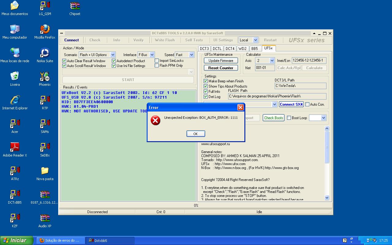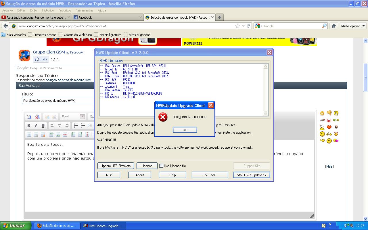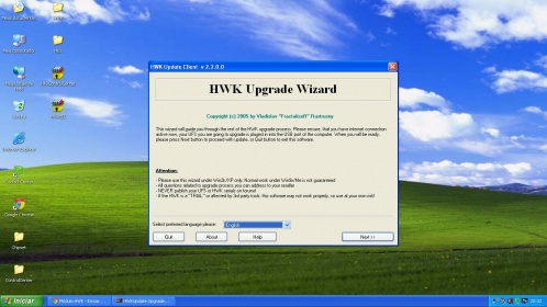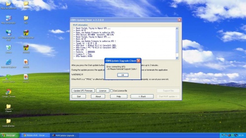 Boa noite a todos, Adquiri uma micro tornado com hwk no clanshop a pouco tempo, tentei instalar no windows 7 e apresentou vários problemas, então, resolvi colocar o win xp porém ela apresenta um problema que não estou conseguindo resolver, preciso da ajuda de vcs. Sou técnico e já realizei esse procedimento várias vezes com sucesso. Para facilitar vou postar o passo a passo que estou seguindo. 1 - Baixei a última versão do HWK_Support_Suite_Setup_v02.02.000(1), instalei normalmente, depois conectei a box e coloquei pra instalar os drives que estão na pasta sarasoft criada pelo próprio programa, os drives são instalados normalmente (Obs. já tentei instalar com os drives que tem aqui no fórum). 2 - Abro o Update Client como segue o print: 3 - Clico em "Next", tenho a informação que os drives estão ok, setup ok, e uma mensagem que nunca vi antes, print em anexo: 4 - Loga em seguida tenho um outro erro, print em anexo: Tentei vários procedimentos, desinstalei e instalei tudo de novo, já formatei a máquina e por fim já mudei pra outro computador. Sempre ocorre o problema, precisa de alguma informação sobre a compra do box para ter acesso ao suporte? Agradeço a ajuda antecipadamente.