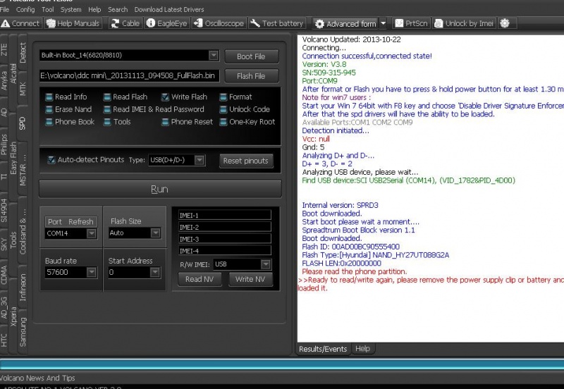 to com um pequeno problema fiz um backup de um outro atc pq tinha dado pal em outro porem vo passa a flash ele reconhece tudo mais nao sei oq fazer Find USB device:SCI USB2Serial (COM42), (VID_1782&PID_4D00) Internal version: SPRD3 Boot downloaded. Start boot please wait a moment.... Spreadtrum Boot Block version 1.1 Boot downloaded. Flash ID: 00AD00BC90555400 Flash Type:[Hyundai] NAND_HY27UT088G2A FLASH LEN:0x20000000 Please read the phone partition. >>Ready to read/write again, please remove the power supply clip or battery and then re-loaded it.
