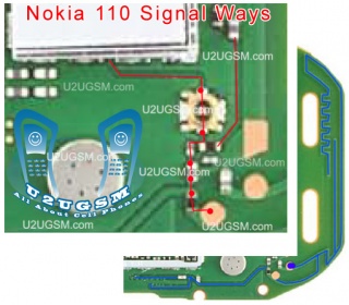 no diagrama acima, existem duas linhas de cores diferentes que mostram faixa completa de componentes e peças que são utilizadas em function.Check sinal de rede todos estes pista e peças para resolver o problema de sinal no Nokia 110 e se algum caminho que falta aplicar jumpers dada na figura acima .