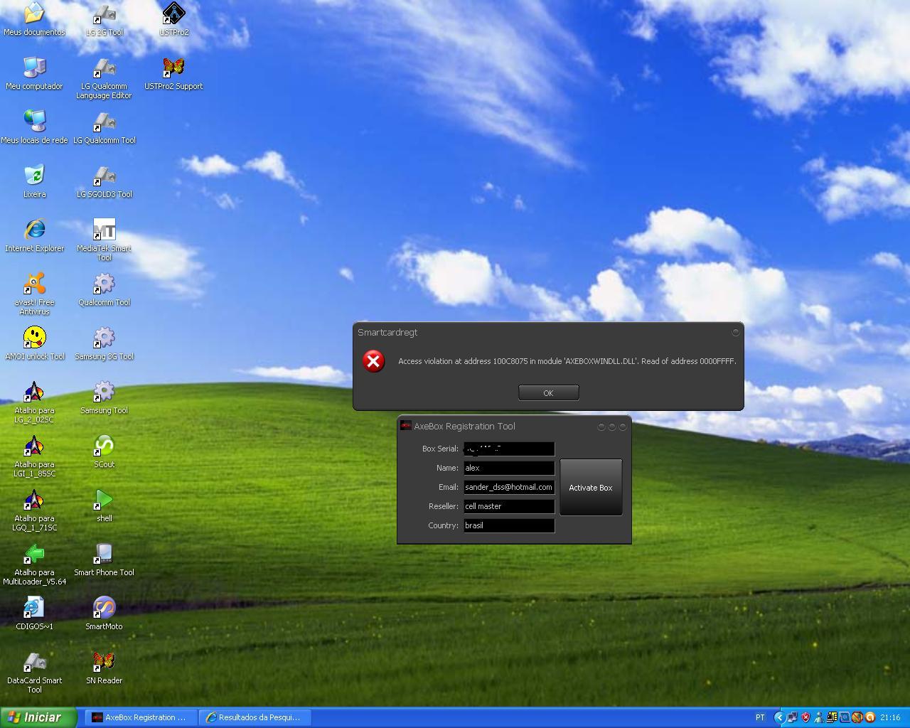 Postado Fevereiro 6, 2011 14 anos ola galera do clan tou com poblema de registrar a minha axe box ela da esta erro alguma soluçao fico muito grato a todos Seu problema é falta de alguns arquivos/requisitos básicos para Axe Box, 1° Siga o que ronysat indicou, baixe o "Active Sync 4.5" 2° Deve baixar o Microsoft .NET Framework 3.5 (Reinicie após) 3° Baixe a última versão da Axe Box (Verifique a seção de atualizações) 4° Precisa instalar o (AxaltoAccessClient) -> Hotfile.com: One click file hosting: AxaltoAccessClient.rar Deixe somente a Axe Box no USB do PC, lembrando que não é aconselhável "USB HUB" Com tudo instalado e a Axe Box em seu PC, reinicie o computador e aperte em "regtool" e siga. Nota: Desinstale tudo que tens instalado antes em seu PC referente a AXEBOX e siga estes passos acima, dificilmente encontrará problemas, e se encontrar estaremos aqui para lhe auxiliar.