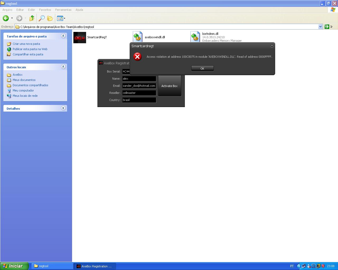 Postado Setembro 21, 2011 14 anos Esta é uma falha na DLL "axeboxwindll.dll" pode substituir a dll atual por esta em anexo e fazer o teste. P.S (Extraia o arquivo do Winrar) Outra sugestão, é importante que esteja usando a última versão disponível, caso não esteja, use o link abaixo; Multiupload.com - upload your files to multiple file hosting sites! Vai precisar tambem ter o "AxaltoAccessClient" instalado, caso não tenha, pegue-o abaixo; Hotfile.com: One click file hosting: AxaltoAccessClient.rar Mais um detalhe, como pude observar, estar usando windows XP, aconselho usar no mínimo SP3, (Eu, particularmente não gosto do SP2) muito obrigado pela ajuda problema resolvido o engraçado que eu ja tinha extraido ess dll de outro post nao deu certo e agora deu certo com essa que vc mandou 100% abrindo agora esse eo forum100%