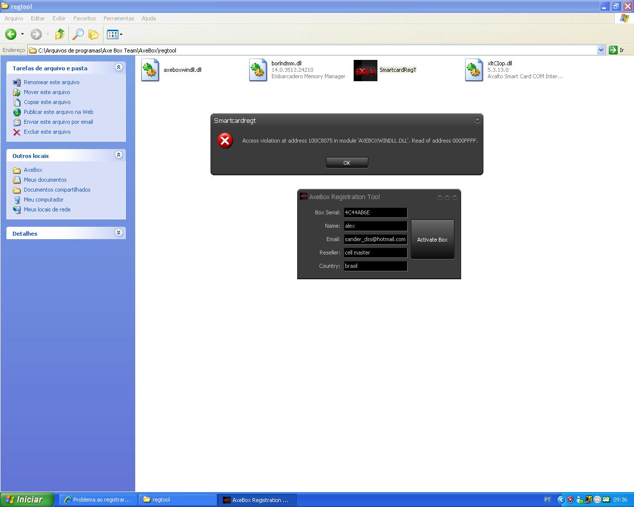 Postado Setembro 20, 2011 14 anos Problema Resolvido Fiz acesso remoto no computador dele, Desinstalei tudo para começar uma instalação limpa, passei até o CCleaner. 1º Instalei o Microsoft .net framework 4.0.(Reiniciei) 2º Instalei o Active Sync 4.5. 3º Instalei o Microsoft Visual C++ 2005 Redistributable Package (x86). 4º Instalei a última versão da Axe Box. 5º Abri o SmartcardRegT e registrei a box com sucesso. Após estes passos eu abri o AxeBox sem problemas. Espero que isto possa ajudar a outros que tiver este mesmo problema. fiz a instalaçao conforme citado acima nao estou conseguindo ativar a box esta dando erro conforme a imagem em anexo