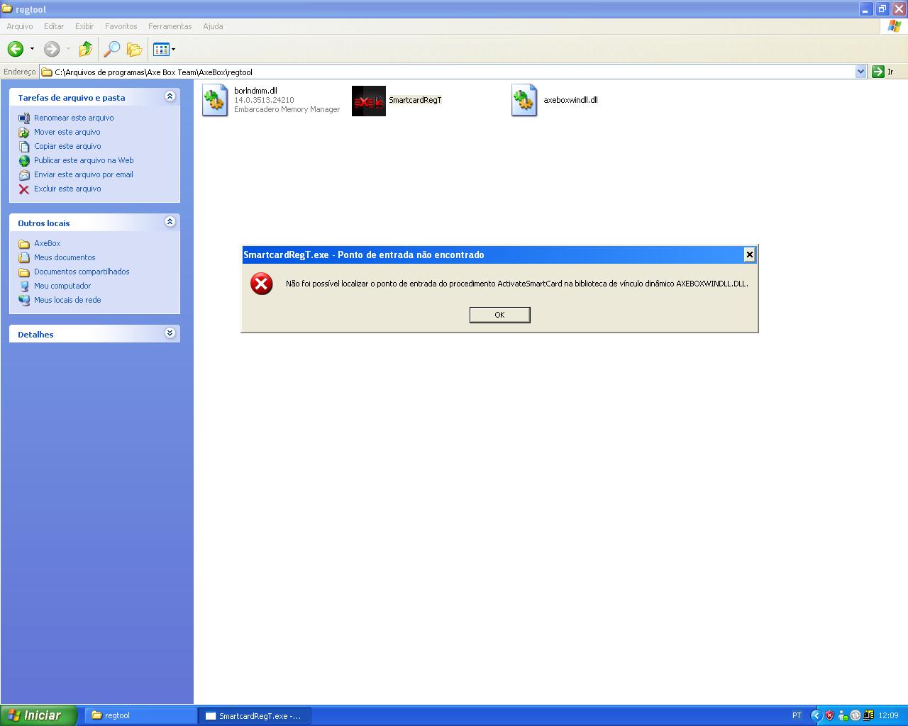 Postado Setembro 20, 2011 14 anos fiz a instalaçao conforme citado acima nao estou conseguindo ativar a box esta dando erro conforme a imagem em anexo [ATTACH=CONFIG]23431[/ATTACH] Esta é uma falha na DLL "axeboxwindll.dll" pode substituir a dll atual por esta em anexo e fazer o teste. P.S (Extraia o arquivo do Winrar) Outra sugestão, é importante que esteja usando a última versão disponível, caso não esteja, use o link abaixo; http://clangs.me/0b828x Vai precisar tambem ter o "AxaltoAccessClient" instalado, caso não tenha, pegue-o abaixo; http://clangs.me/zw7cA2 Mais um detalhe, como pude observar, estar usando windows XP, aconselho usar no mínimo SP3, (Eu, particularmente não gosto do SP2) axeboxwindll.rar