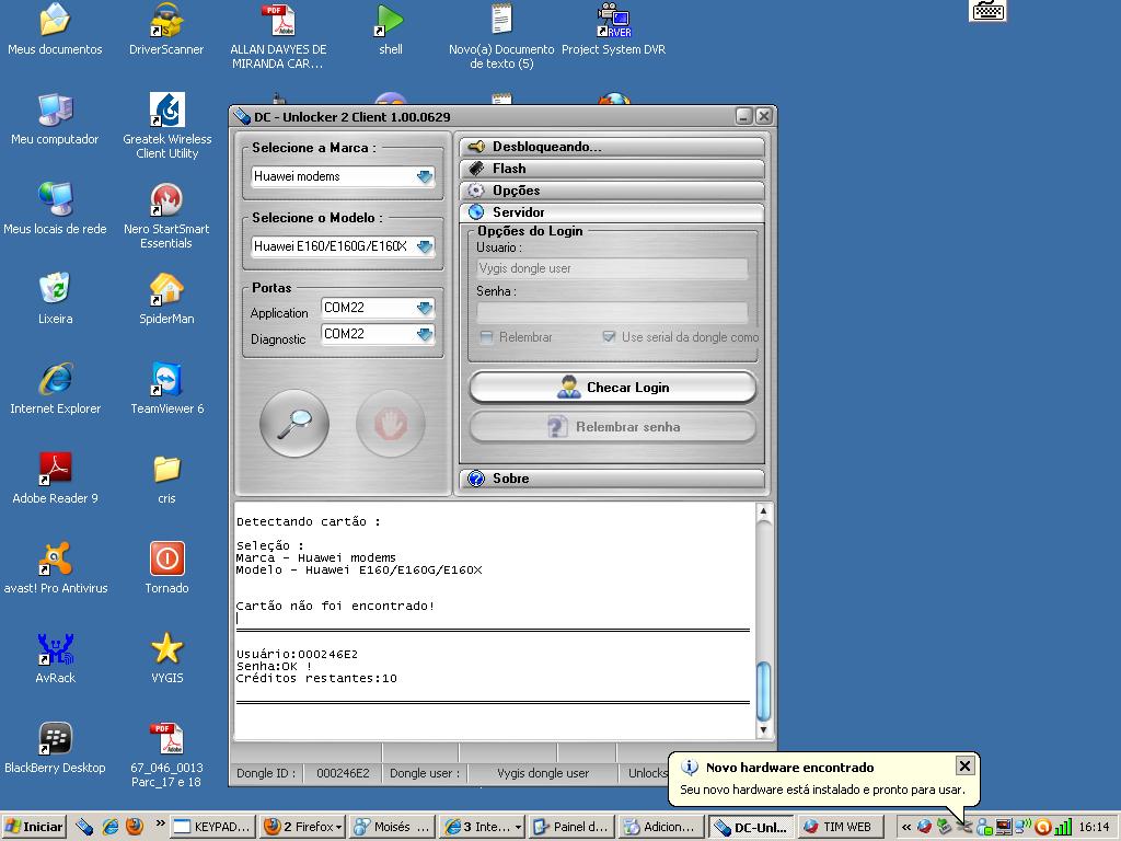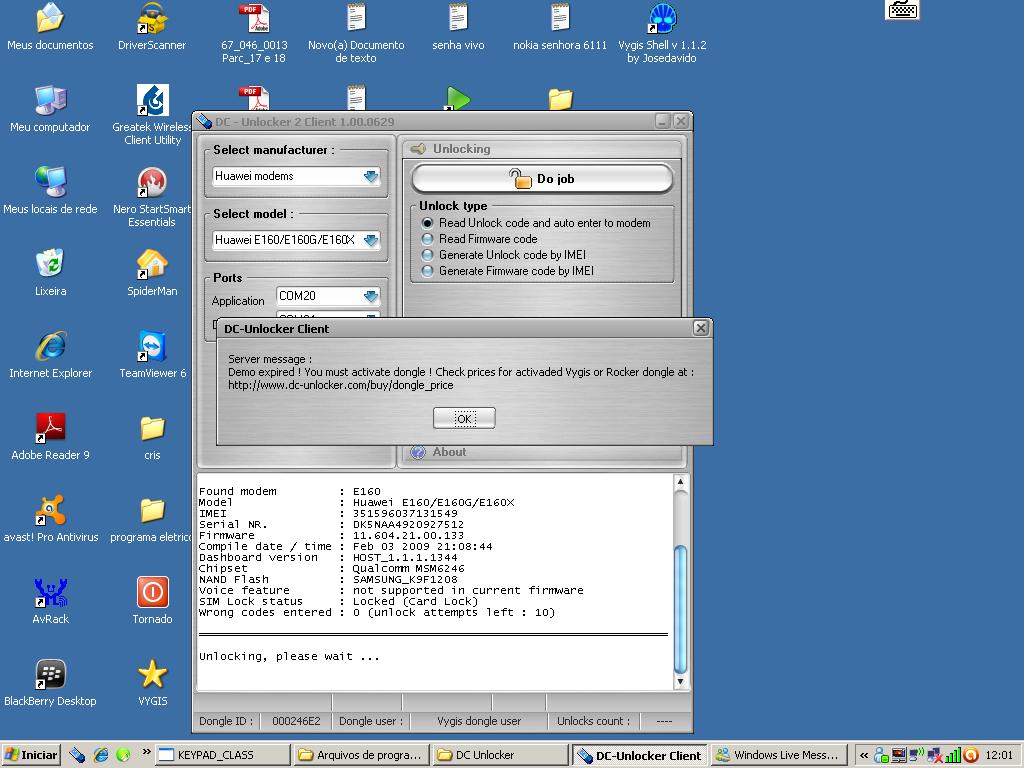 Não está ativo. O senhor deverá comprar os créditos com nossos parceiros. Mas a titulo de teste o servidor da DCUnlocker dispõe de 15 créditos free para os usuários da Vygis. Se o senhor ainda não usou é só ir no programa clicar em server, e depois em check login. Espero ter ajudado.
