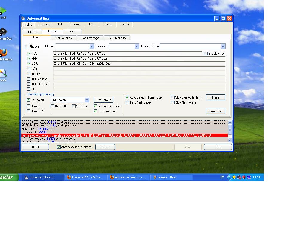 OLa amigos do clan estou tentando fazer flash em um nokia 1661 para corrigir alguns erros tipo relaçao de chamadas q nao aparece e mais alguns erros . possuo a universal box , ela ate faz a leitura do aparelho mas quando seleciono os arquivo q mando gravar apresenta um erro vou postar imagen.